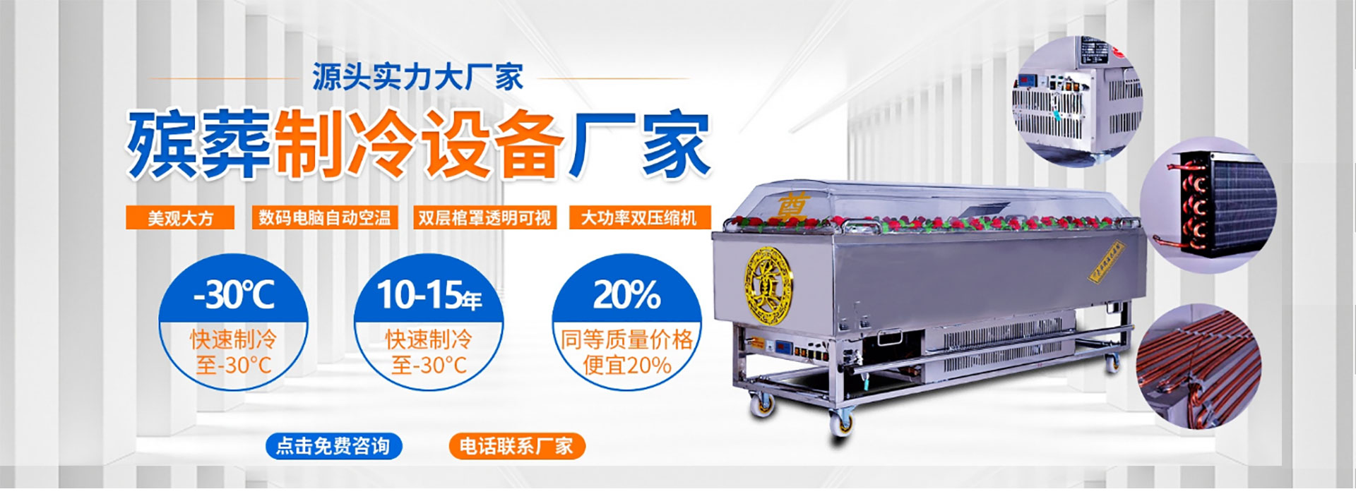 駐馬店市吉遠制冷設備有限公司成立于2006年2月份,注冊于2009年8月31日,注冊資金500萬元。有生產銷售人員40多人。年產值5000臺。公司主要經營銷售冰棺,水晶棺,電子禮炮,太平柜,車載運尸柜,瞻仰棺,手提冰棺,靈棚,氣模,水晶棺材等大型殯葬用品。造型美觀、經久耐用。